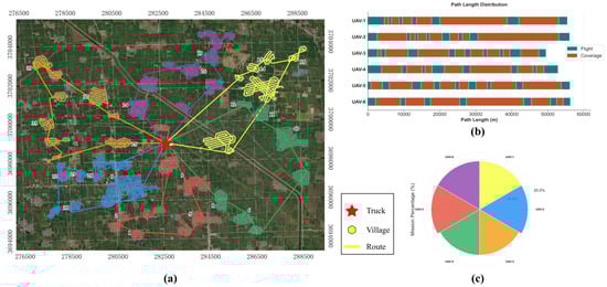 (a) UAV route and scheduling results for Henan, China. (b) Gantt chart of the mission paths. (c) Rose plot of the task load balance.