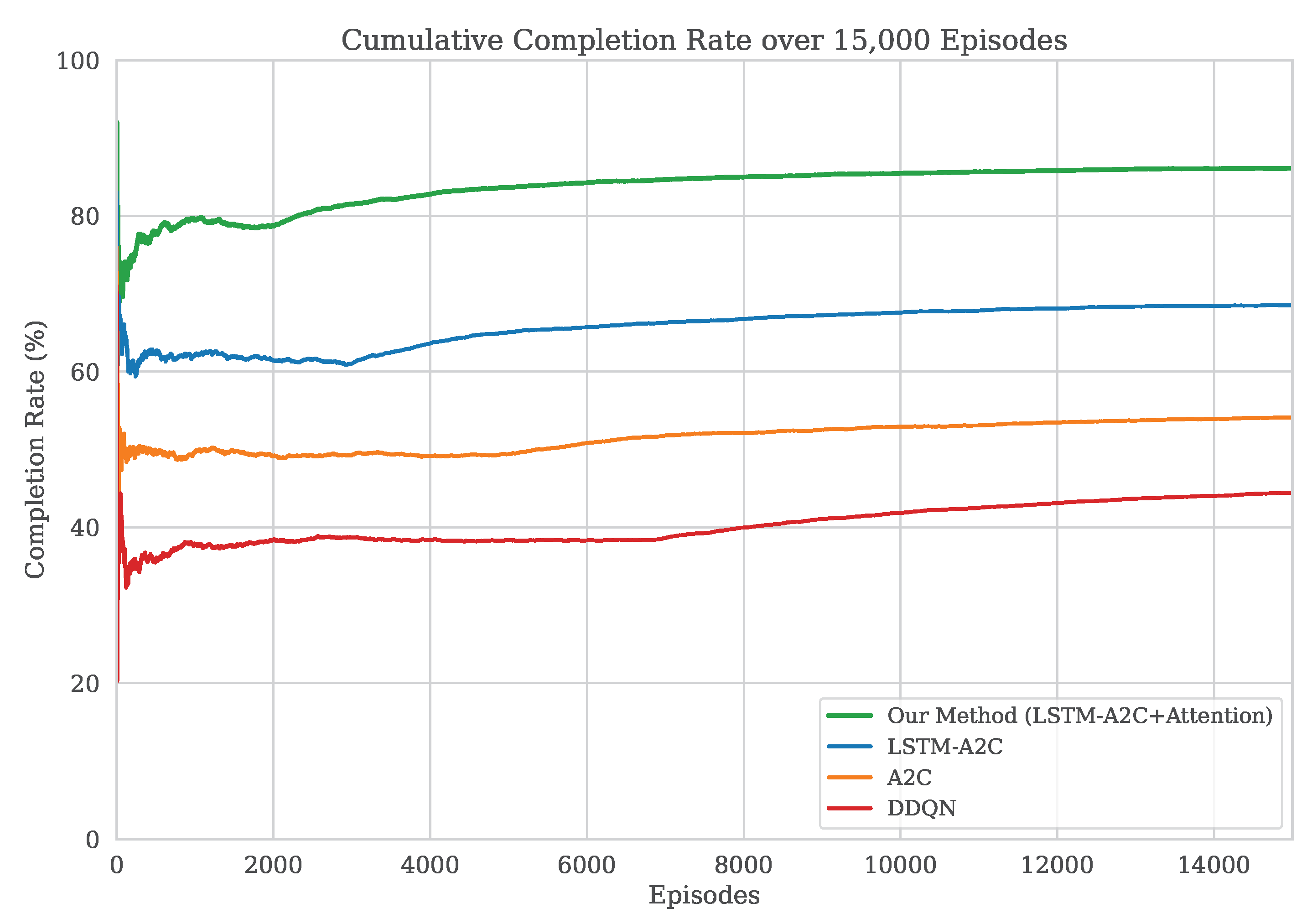 An important finding from this work is the clear computational trade-off between offline training cost and online deployment efficiency. Although the proposed LSTM-A2C with attention requires greater computational effort during training due to its sequential modeling and attention modules, this investment yields significant dividends at deployment: the trained policy enables faster real-time decision-making, reduced inference latency, and improved energy utilization. This result highlights the practical value of allocating additional offline computational resources to achieve superior operational performance and responsiveness in mission-critical environments.