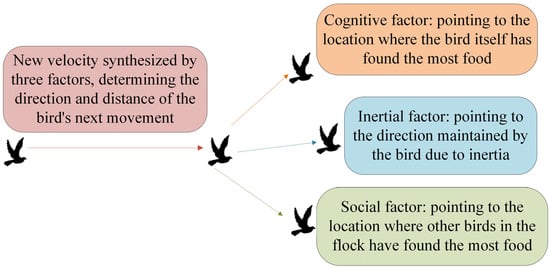 The Particle Swarm Optimization (PSO) algorithm performs parallel path optimization by simulating the foraging behavior of bird flocks, as illustrated in Figure 3. With its strong global search capability and flexible parameter adjustment, PSO has become one of the core algorithms for AUV cluster path planning in large-scale and complex marine environments. However, the traditional PSO algorithm easily suffers from premature convergence and local optima. These issues have motivated further studies focused on maintaining population diversity and improving dynamic adaptability.