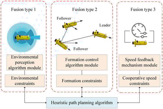 Hybrid heuristic algorithms integrate the core mechanisms of different optimization methods to achieve complementary advantages. They are designed to handle multi-objective optimization problems in complex marine environments. Existing studies have mainly proposed three integration types, as illustrated in Figure 4.