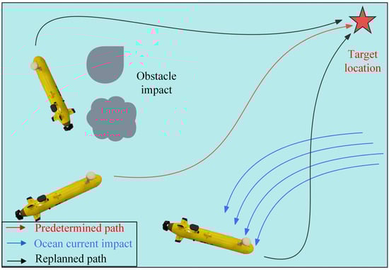 Heuristic re-planning strategies in dynamic environments represent a key research direction in AUV cluster path planning. Their main goal is to maintain a balance between global optimality and real-time adaptability through continuous environmental feedback and online decision adjustment. Static pre-planning approaches cannot adapt to the dynamic and uncertain nature of marine environments, where time-varying currents, communication delays, and sensor noise often cause path deviations. As a result, research has increasingly focused on heuristic re-planning frameworks that integrate real-time perception, distributed decision-making, and adaptive optimization to enhance robustness against dynamic disturbances, as illustrated in Figure 5.