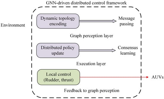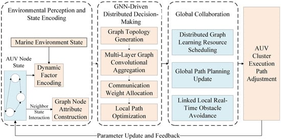 GNNs and distributed control strategies have recently emerged as the third major paradigm in AUV cluster path planning, addressing the scalability and adaptability limitations of traditional centralized frameworks. GNNs provide a powerful means for topological representation learning, enabling each AUV node to process local information while maintaining global coordination through message passing across network edges. By integrating GNNs with distributed control theory, dynamic topology perception and cooperative decision optimization can be achieved under real-time communication constraints. This combination significantly enhances the robustness and scalability of AUV clusters operating in complex marine environments. Figure 7 depicts the general framework of a GNN-driven distributed AUV cluster planning system. Figure 8 conceptually illustrates how graph learning mechanisms mitigate communication constraints and support dynamic topology adaptation.