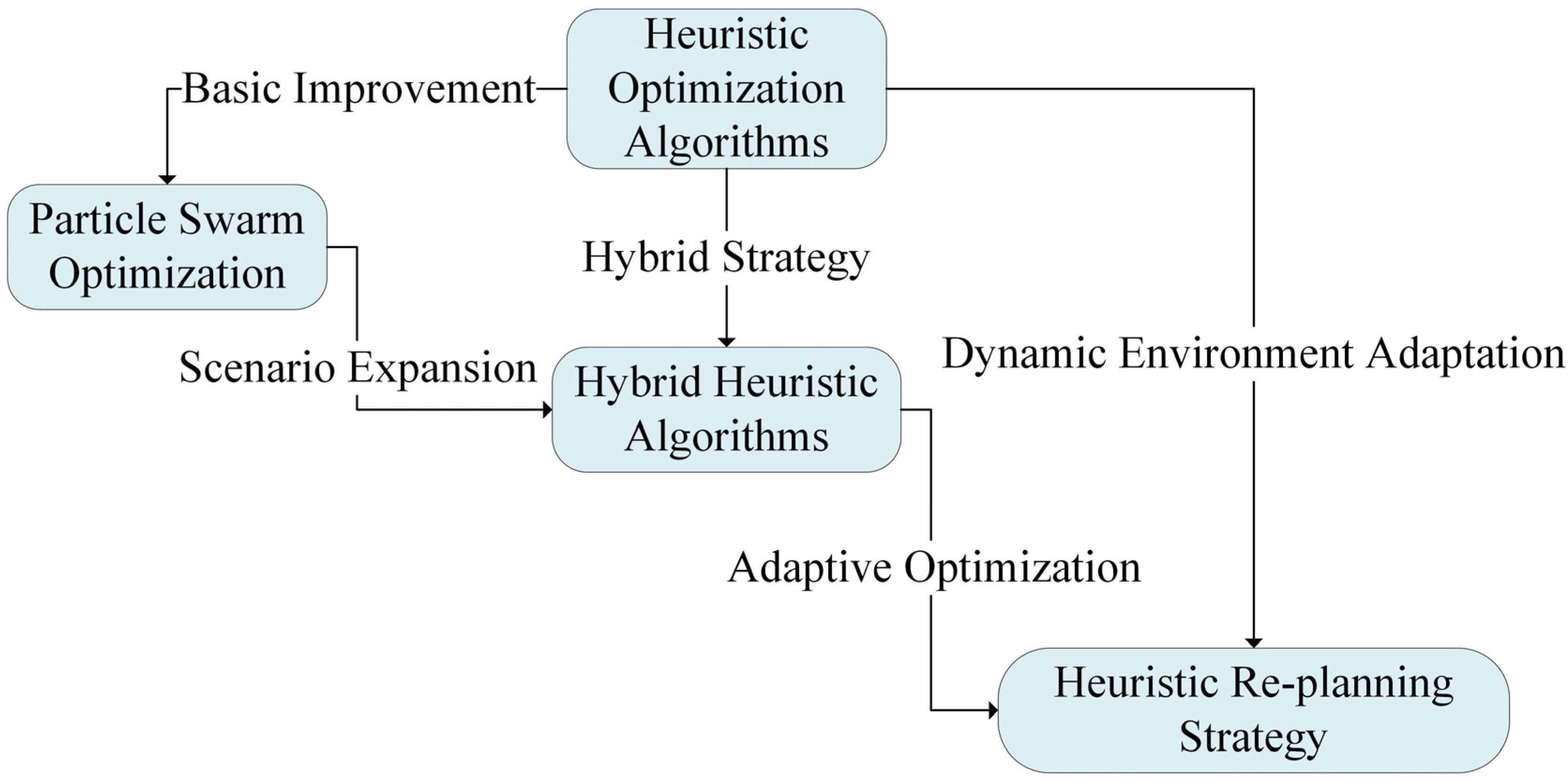 In recent research, a four-dimensional optimization balance has been emphasized, involving path accuracy, energy efficiency, temporal constraints, and robustness. These four objectives jointly define the optimization focus of heuristic approaches. Based on these principles, three major algorithmic frameworks have been developed: swarm intelligence algorithms, hybrid evolutionary algorithms, and heuristic re-planning strategies, as illustrated in