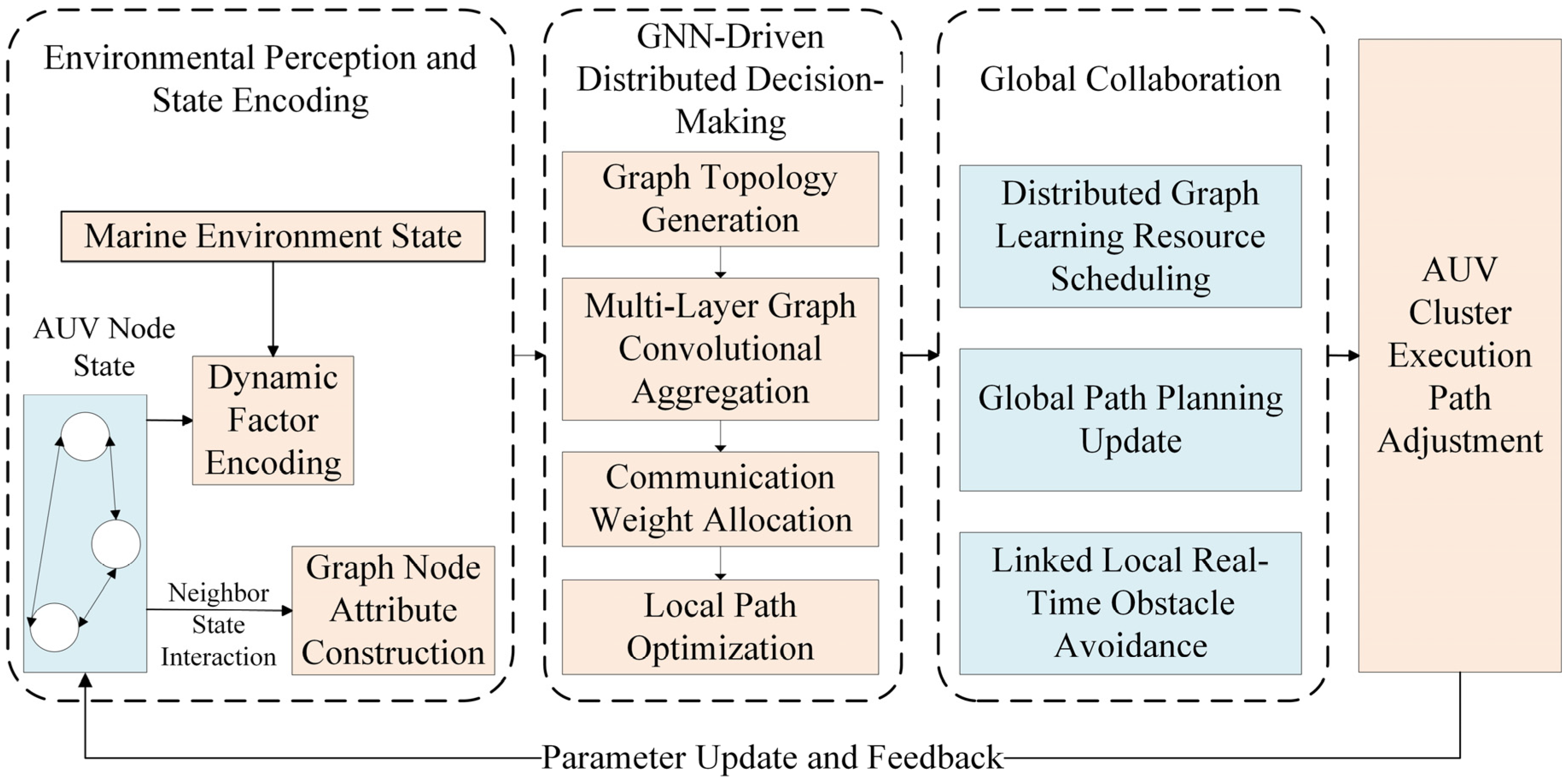 Figure 7 depicts the general framework of a GNN-driven distributed AUV cluster planning system.