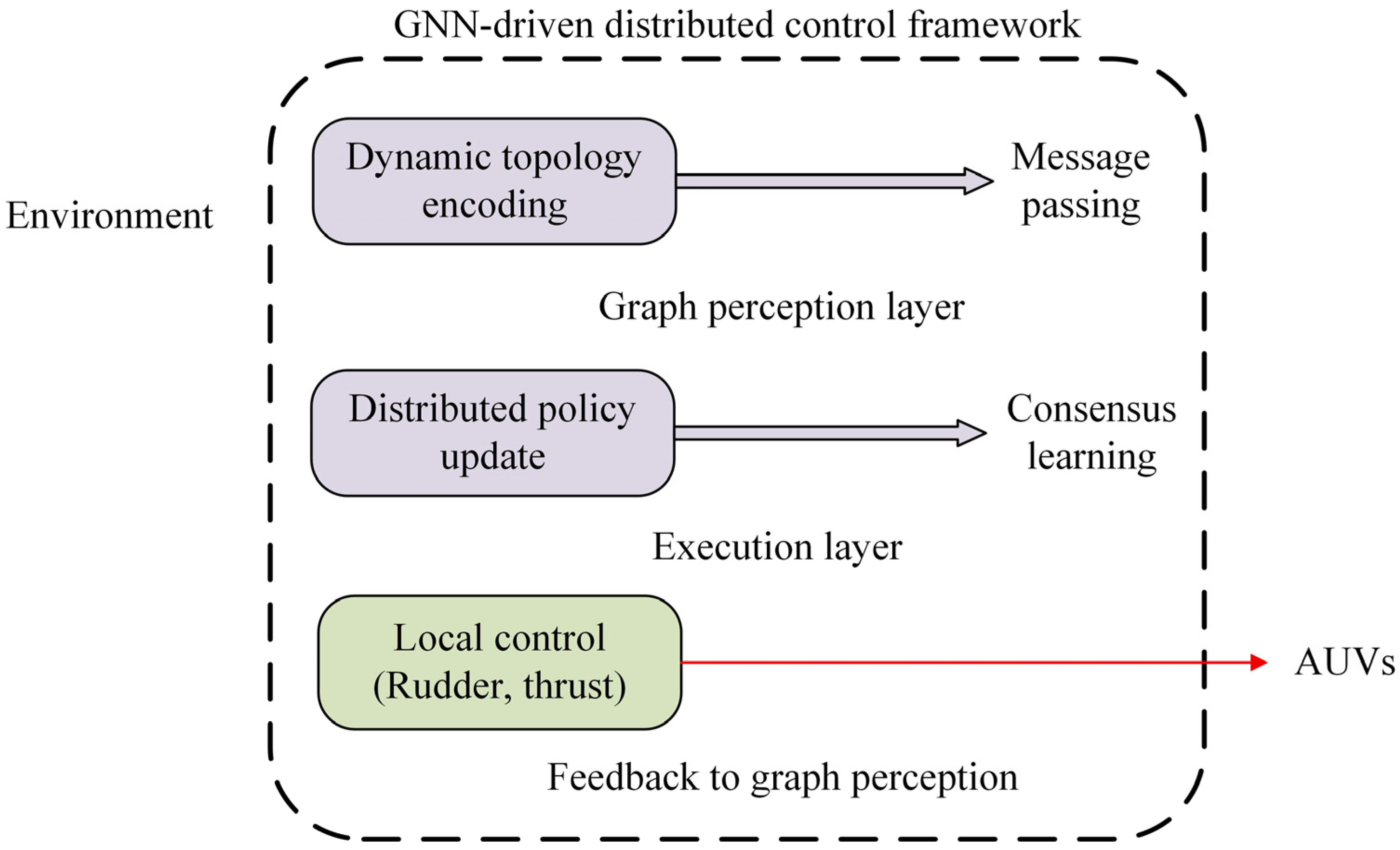 The integration of graph learning and distributed control establishes a hierarchical feedback mechanism. GNNs perceive and encode the evolving network structure, whereas distributed control translates this perception into synchronized actions among AUVs. This bidirectional interaction allows real-time topology reconfiguration and ensures consistent cooperative behavior across heterogeneous agents. Compared with traditional approaches, this architecture provides a scalable foundation for robust underwater swarm coordination.