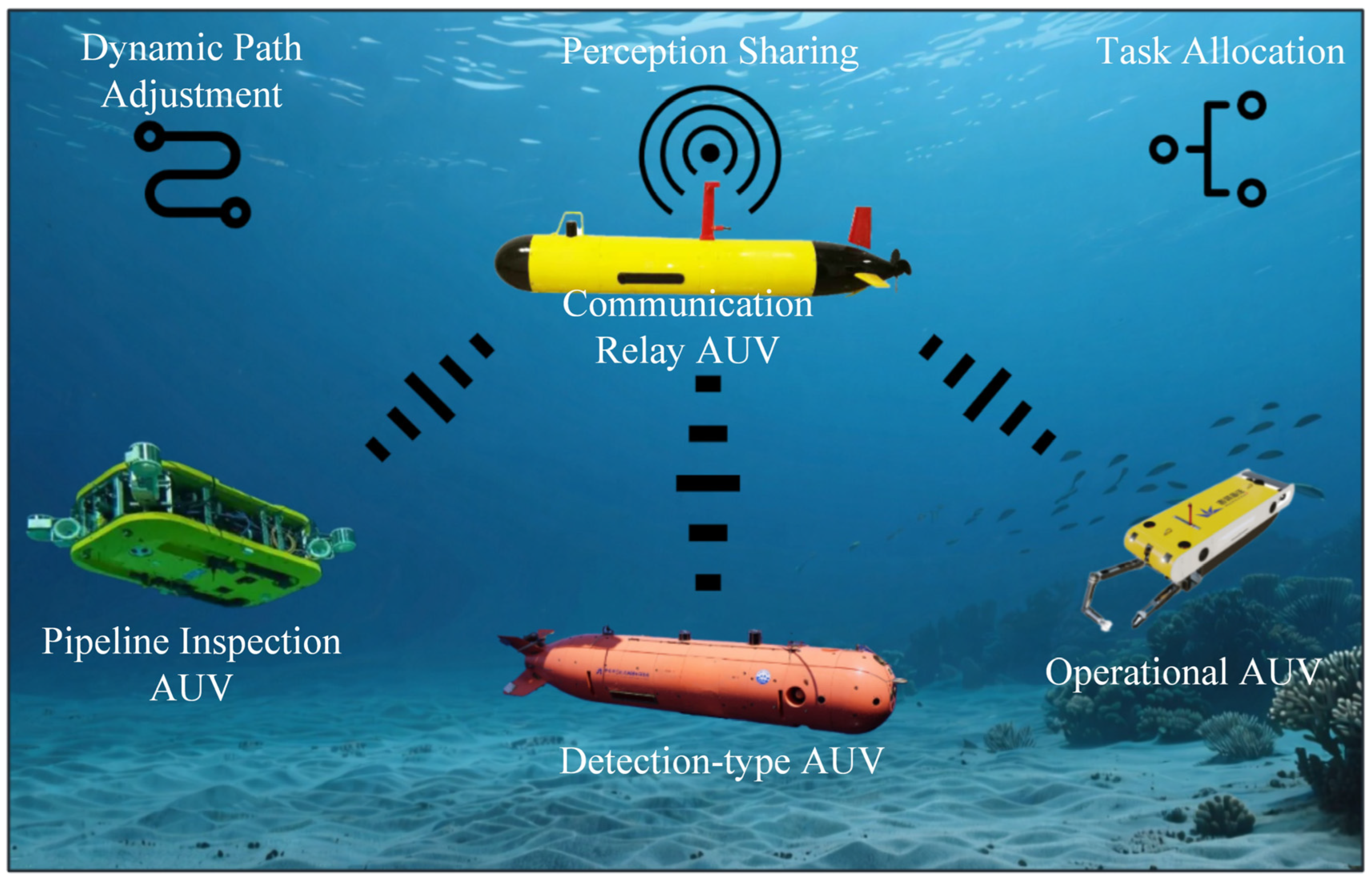 Although numerous differences are observed between underwater and aerial environments in terms of communication latency, sensor types, and dynamic disturbances, important cross-domain references for AUV clusters have been provided by research findings on Unmanned Aerial Vehicle (UAV) swarm cooperative path planning. In particular, at the level of multi-agent cooperative control algorithms, the core logic of distributed decision-making and dynamic path optimization methods for UAV swarms can be transferred to AUV cluster scenarios. For example, the multi-agent deep reinforcement learning framework proposed for multi-UAV systems achieves individual trajectory optimization and global coordination through distributed policy gradients, providing new insights for solving real-time path adjustment problems of AUV clusters in communication-constrained environments [