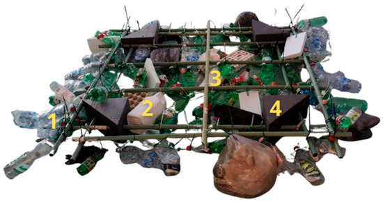 Figure 1. Plastic target used in the experimental campaign, composed of bottles (1), containers (2), and polystyrene blocks, which are either white (3) or graphite (4). - Natural Target: An almost 5 m diameter compact aggregation of floating leaves and plant debris, naturally accumulated along the shore of the lake. The natural target is used to test the ability of UAV platforms to discriminate the plastic target from natural litter.