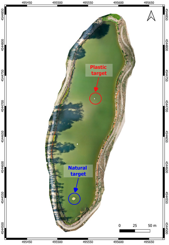 - The plastic target, situated in the central–northern region of the lake, which is marked by a red circle;