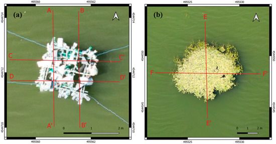 High-resolution optical orthomosaic over the plastic (a) and the natural (b) target. Reference transects selected for the quantitative analysis are also annotated as red lines.