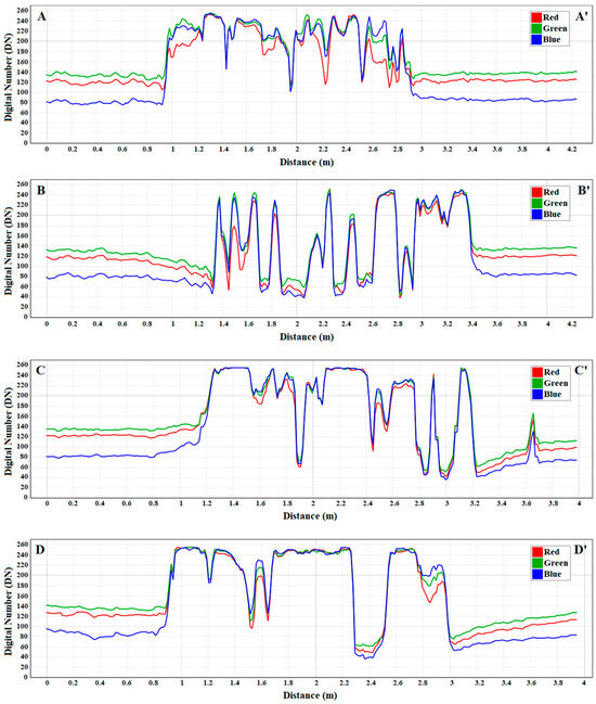 Optical response of red (red curve), green (green curve), and blue (blue curve) bands evaluated along the transects (A–A′, B–B′, C–C′, D–D′) excerpted over the area affected by the plastic target; see Figure 3a. The x-axis represents the distance in meters along each profile, and the y-axis shows the reflectance values in DN.