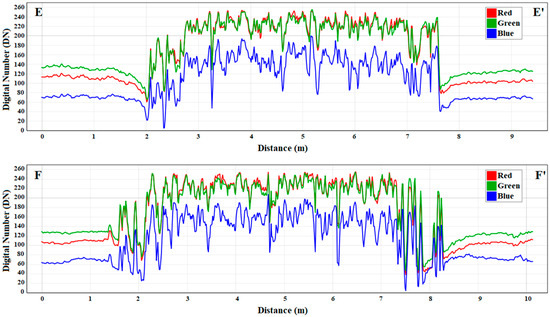 Optical response in the red (red curve), green (green curve) and blue (blue curve) bands evaluated along the transects (E–E′ and F–F′) excerpted on the natural target. The x-axis represents the distance in meters along each profile, while the y-axis shows the reflectance values in DN.
