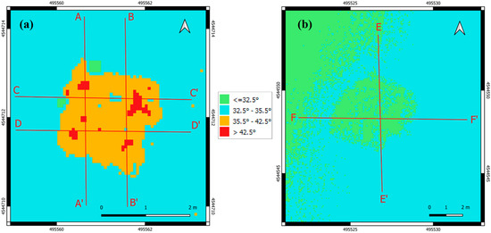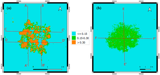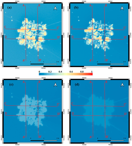 To enable a quantitative analysis, reference transects were considered across both targets, as shown by the lines in Figure 3. For the plastic target, four transects were defined to capture the internal heterogeneity of the deployed structure: A–A′ and B–B′ (north–south orientation) and C–C′ and D–D′ (east–west orientation); see Figure 3a. For the natural target, which exhibits a more homogeneous distribution, two orthogonal transects were drawn: E–E′ (north–south) and F–F′ (west–east); see Figure 3b. These transects provide spatially consistent references for subsequent spectral and radiometric analyses.