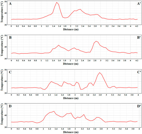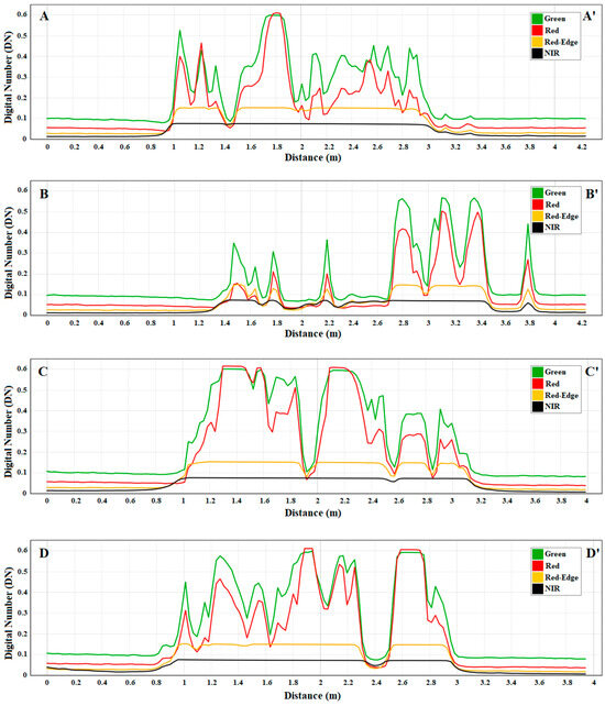 Multispectral response of green (green curve), red (red curve), red edge (orange curve) and NIR (black curve) bands evaluated along the transects (A–A′, B–B′, C–C′, D–D′) excerpted on the plastic target. The x-axis represents the distance in meters along each profile, and the y-axis shows the reflectance values in DN.