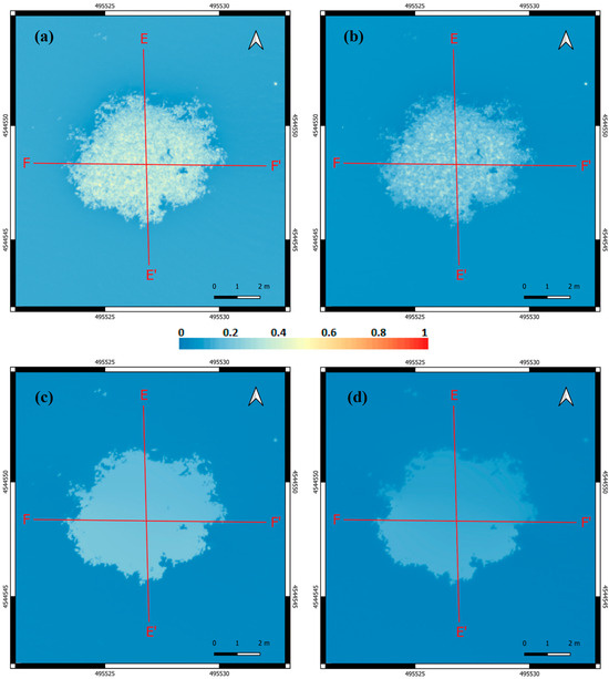 In Figure 6a–d the orthomosaics of the plastic target in the Green, Red, Red Edge, and NIR bands are depicted, respectively.