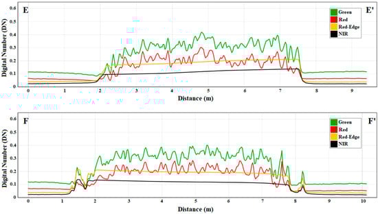 Multispectral reflectance values evaluated along with the transects (E–E′, F–F′) excerpted over the of green (green curve), red (red curve), red edge (orange curve) and NIR (black curve) bands of the image related to the natural target. The x-axis represents the distance in meters along each profile, and the y-axis shows the reflectance values in DN.