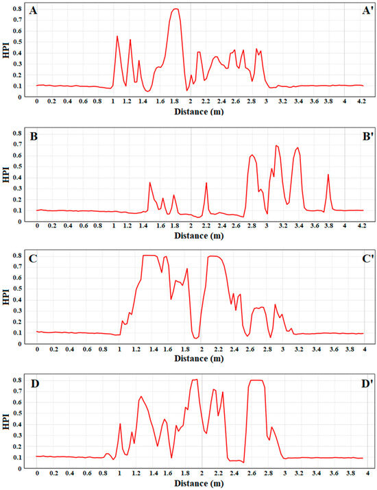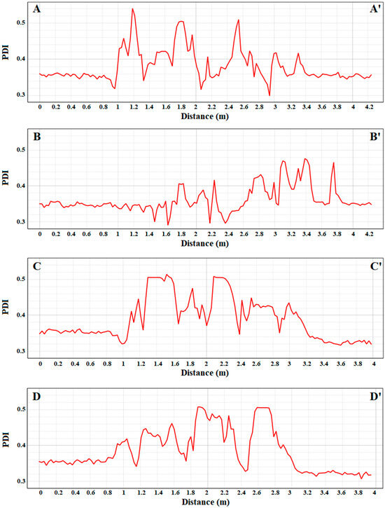 The quantitative analysis, carried out by evaluating the reflectance values along with the transects of Figure 3, is depicted in Figure 9, which supports the qualitative visual interpretation. In both transects E–E′ and F–F′, the Green and Red curves are the most reflective, showing smooth and stable patterns with only minor oscillations. The Red Edge and NIR curves, while lower in magnitude, are continuous and regular, with values typically between 0.15 and 0.25. Unlike the plastic target, no sharp peaks or abrupt changes are observed, confirming the homogeneous and compact nature of the vegetation mass.