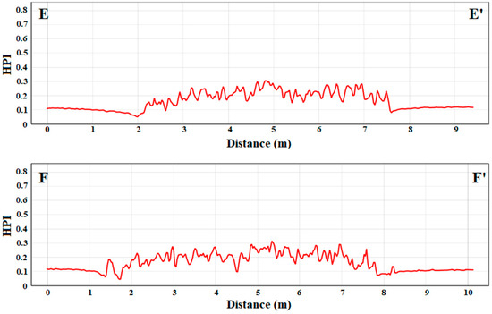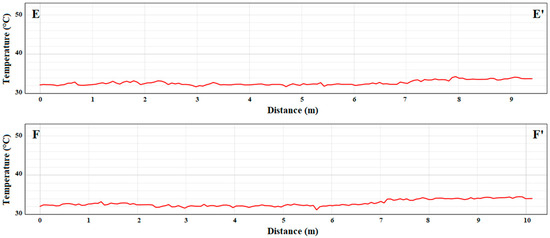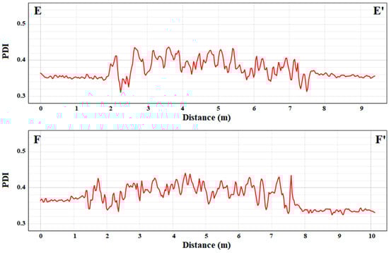 In Figure 5, the transect analysis that refers to the natural target, see Figure 3b, is depicted, showing the reflectance profiles along transects E–E′ and F–F′. In this case, a more homogeneous spectral behavior is obtained: the Red and Green bands maintain stable high values, while the Blue band remains consistently lower. Oscillations are smoother and more regular than those of the plastic target.