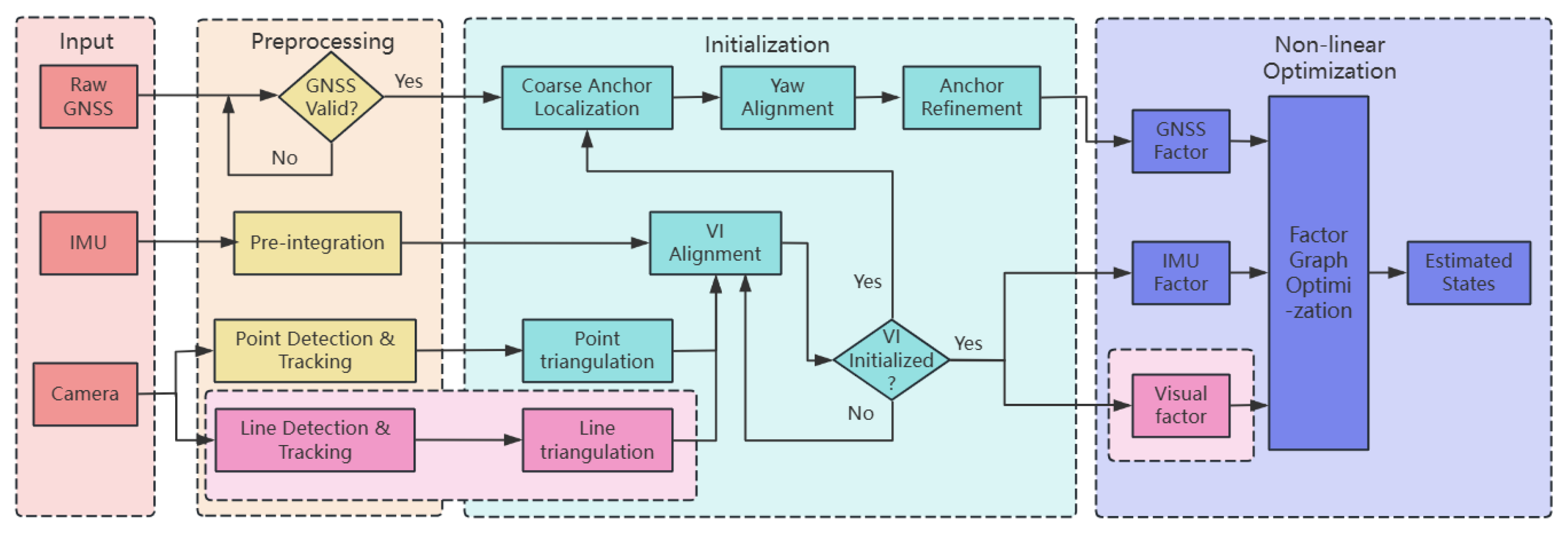 This section briefly introduces GVINS, which tightly couples raw GNSS measurement information, visual information, and inertial information for drift-free UAV positioning. It involves three steps: data preprocessing, system initialization, and nonlinear optimization. During preprocessing, GNSS signals are filtered, and image features are extracted and tracked. Initialization aligns image and inertial coordinates, then uses a coarse-to-fine approach to determine and refine an anchor point, enabling absolute position calculation from relative data. Measurements are modeled within a factor graph to constrain system states. GVINS’s multi-sensor fusion ensures stable output in challenging environments, reducing VIO drift and maintaining accuracy under noise. The subsequent focus is on GPLVINS, especially improvements in line feature processing and optimization. Other details can be found in [2].