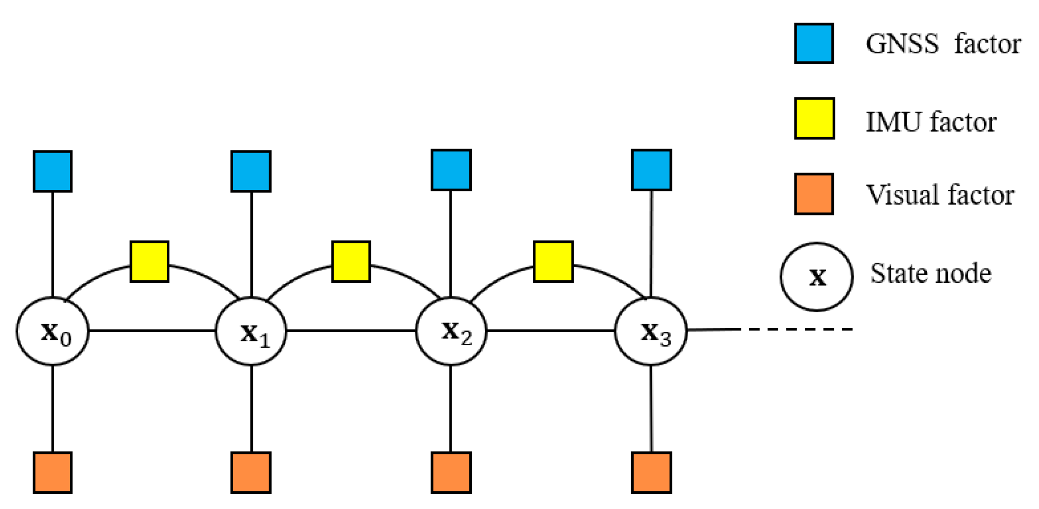 Figure 4. The factor graph of The nonlinear optimization problem. System states are circles. GNSS factors are blue squares. IMU pre-integration factors are yellow squares, and visual factors are orange squares.