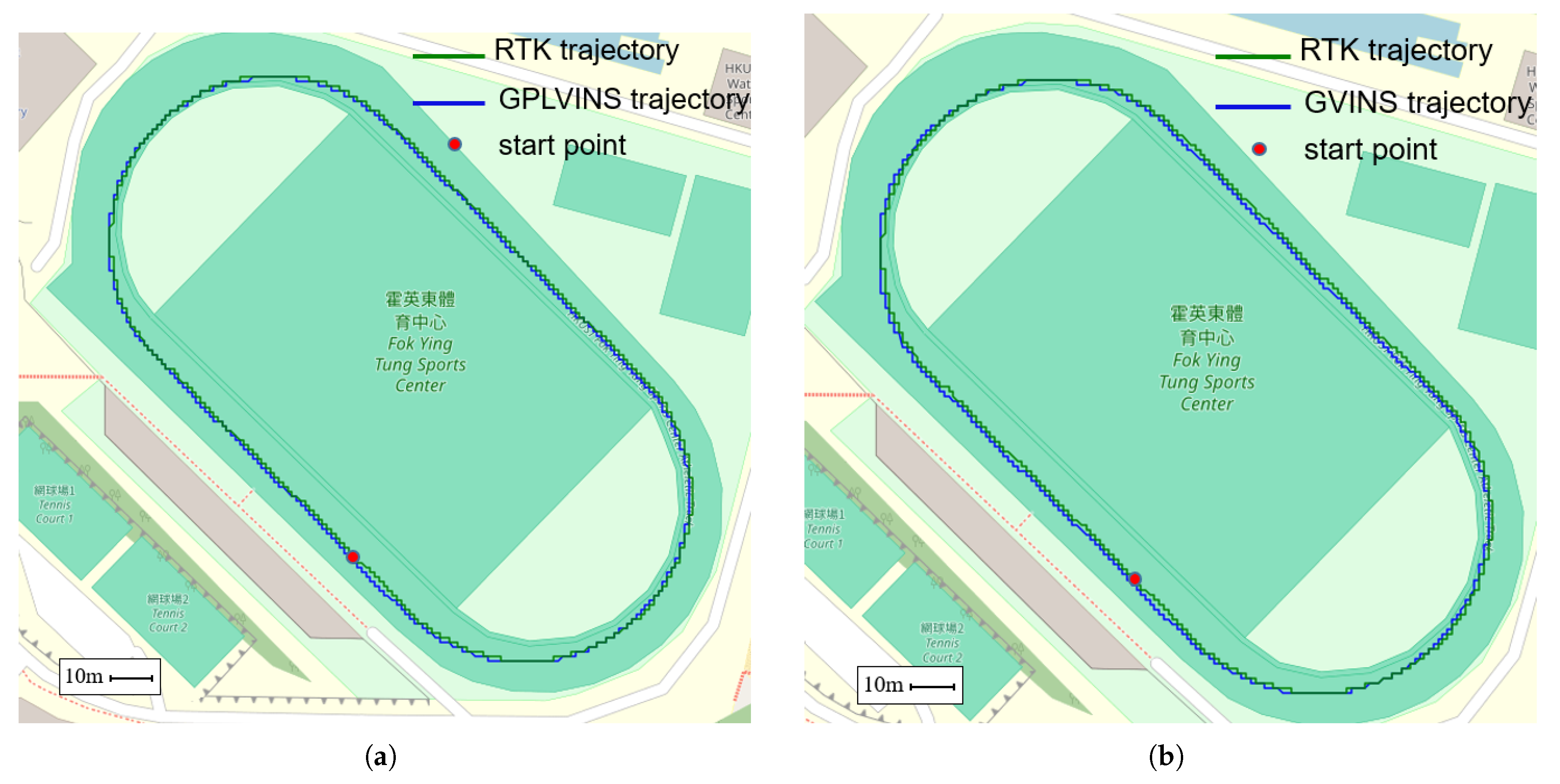 Figure 5. Trajectory comparison of GPLVINS and GVINS on the open-source dateset of [2]: (a) GPLVINS and (b) GVINS. With the RTK trajectory being regarded as the ground truth, the closer the trajectory of the algorithm is to the RTK trajectory, the higher its positioning accuracy. In (a), the trajectory of GPLVINS is closer to the green RTK trajectory, which is more clearly observable in the straight section of the runway.