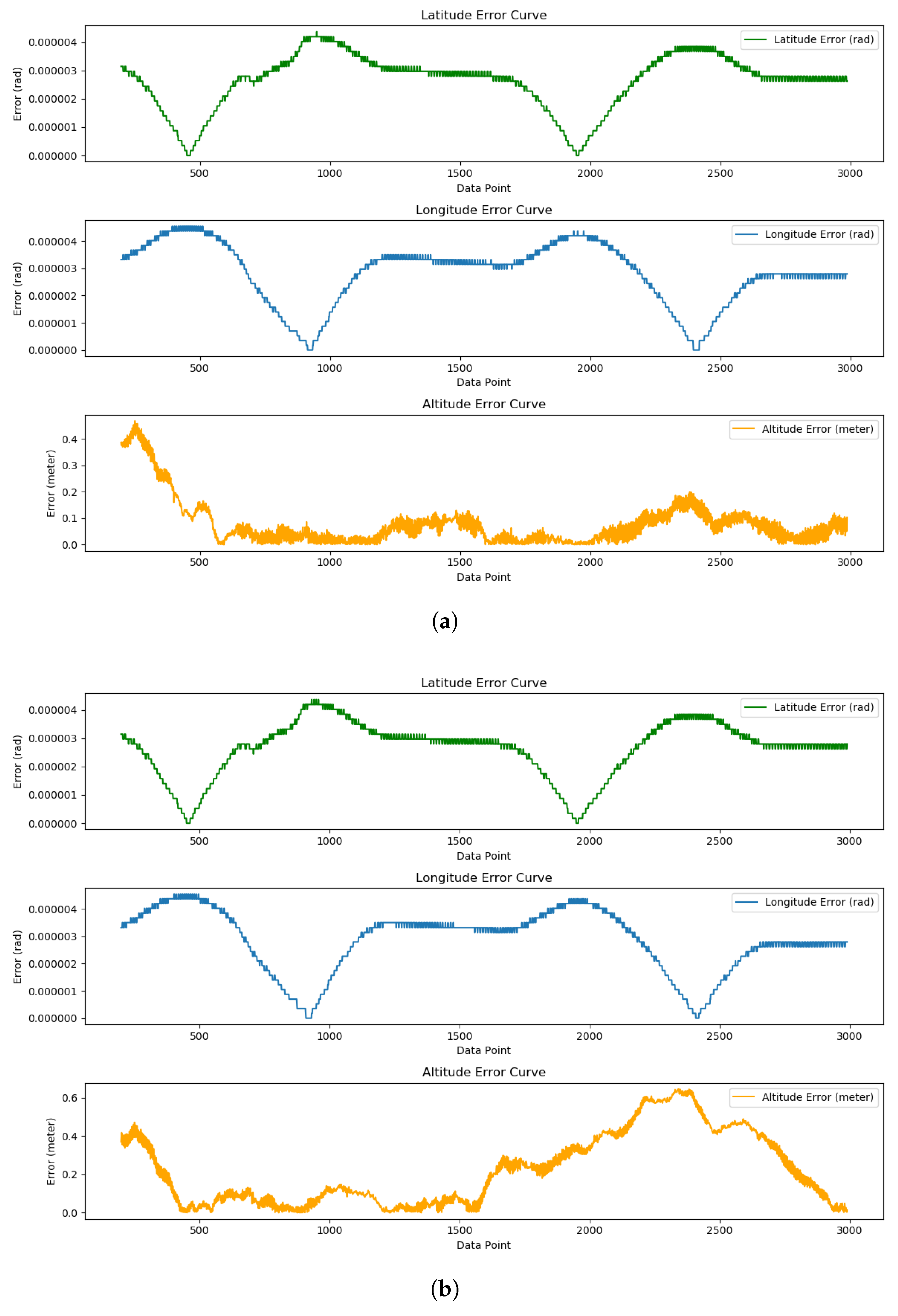 Table 2. RMSE results of latitude, longitude, and altitude for two algorithms. When translated into linear distances, the RMSE values of longitude and latitude also lie in the 10 6 -m order of magnitude—leading to very small positioning errors. In this case, line constraints yield limited improvements in the positioning accuracy of longitude and latitude while delivering more significant improvements in the positioning accuracy of altitude.