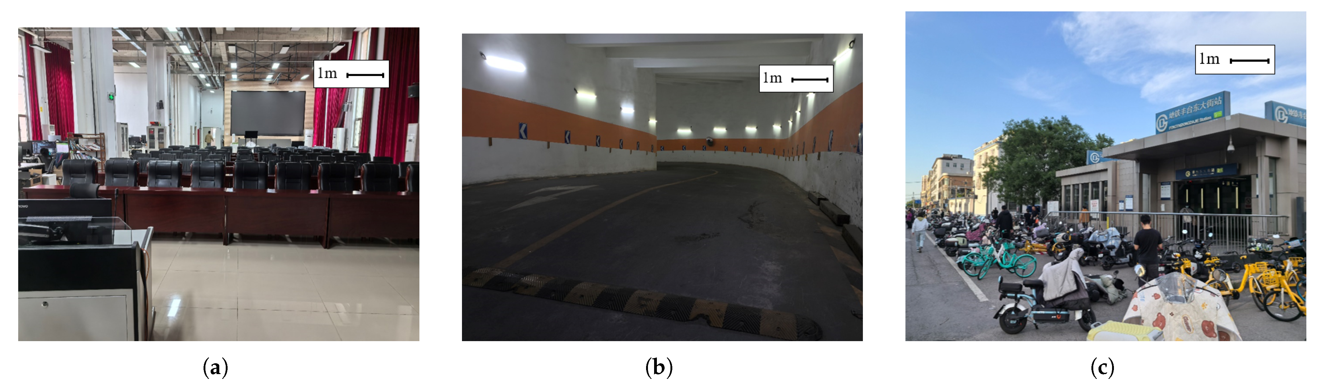 Figure 7. Real-scene photos of recording scenarios: (a) conference room; (b) underground parking lot; (c) subway station. Sparse features in partial scenarios and GNSS signal failure will introduce cumulative errors to trajectory estimation, leading the algorithm-estimated trajectory to exhibit a discrepancy between its start and end points. This phenomenon is thus used to evaluate the performance of the algorithm.