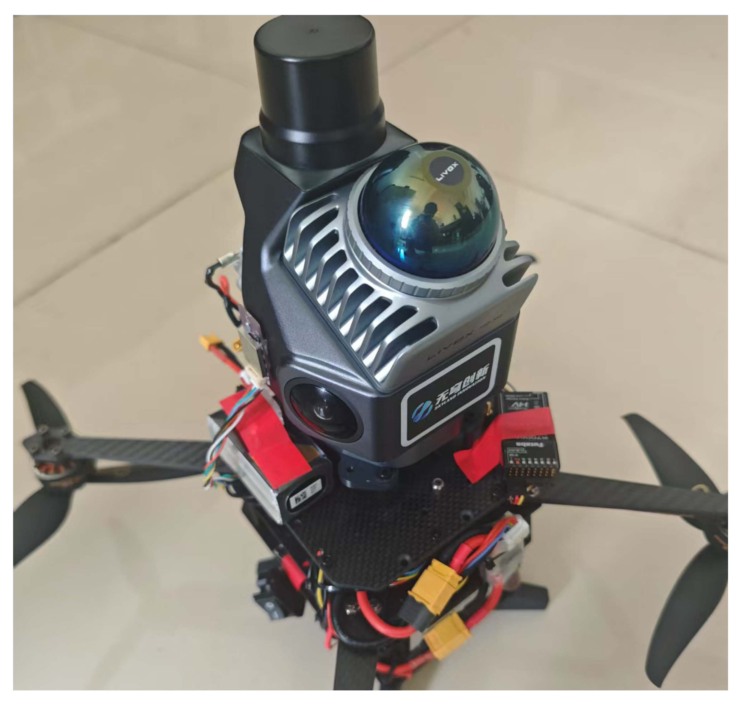 Figure 8. Equipment used for recording datasets. The UAV is equipped with a monocular camera, an IMU, a GNSS receiver, and a LiDAR on its top, where the LiDAR was not used in this experiment.