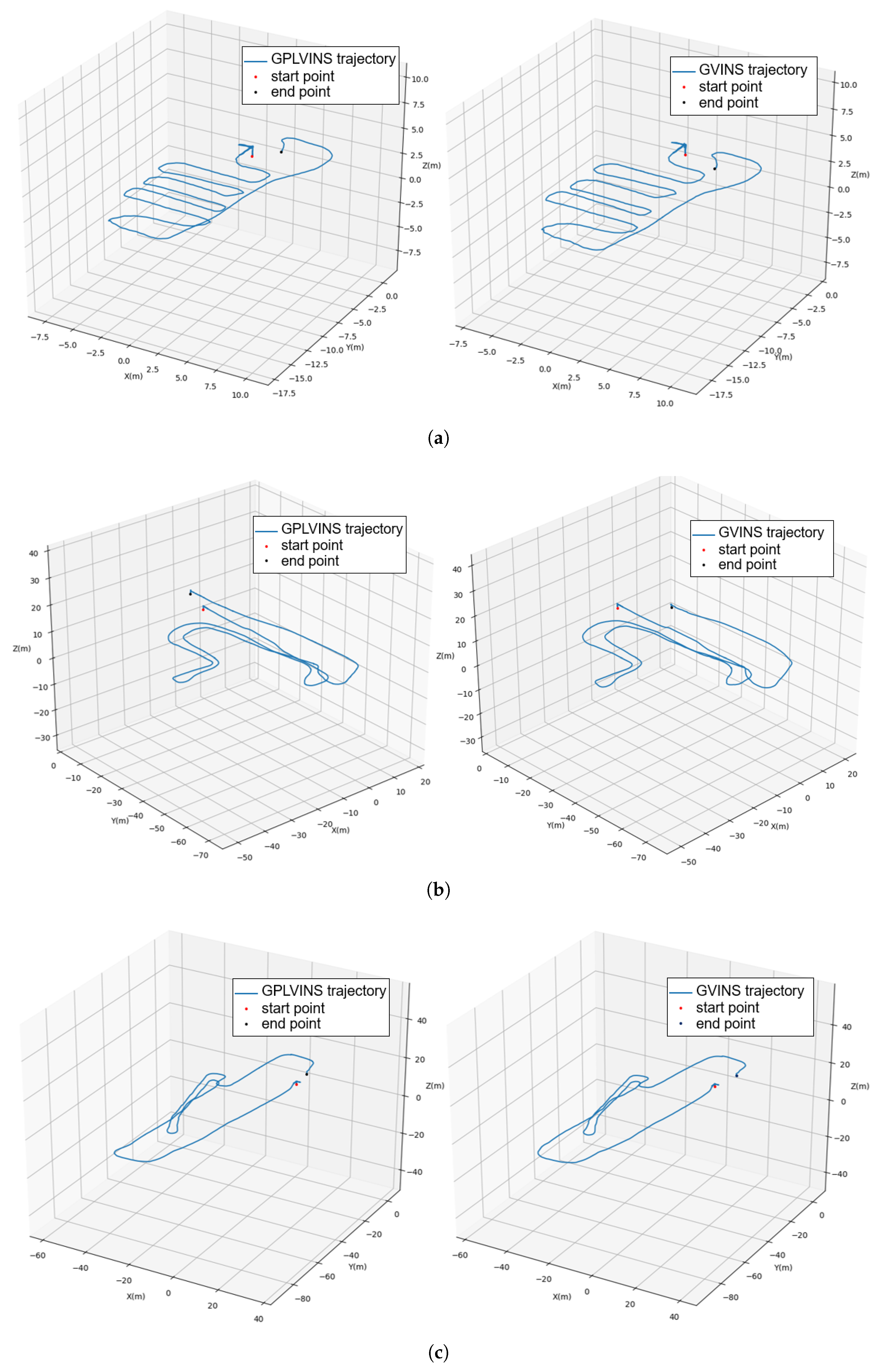 Next, GPLVINS and GVINS were run on the three sequences, respectively, and the cumulative error evaluation method was used to evaluate the performance of GPLVINS. The result trajectories are shown in Figure 9.