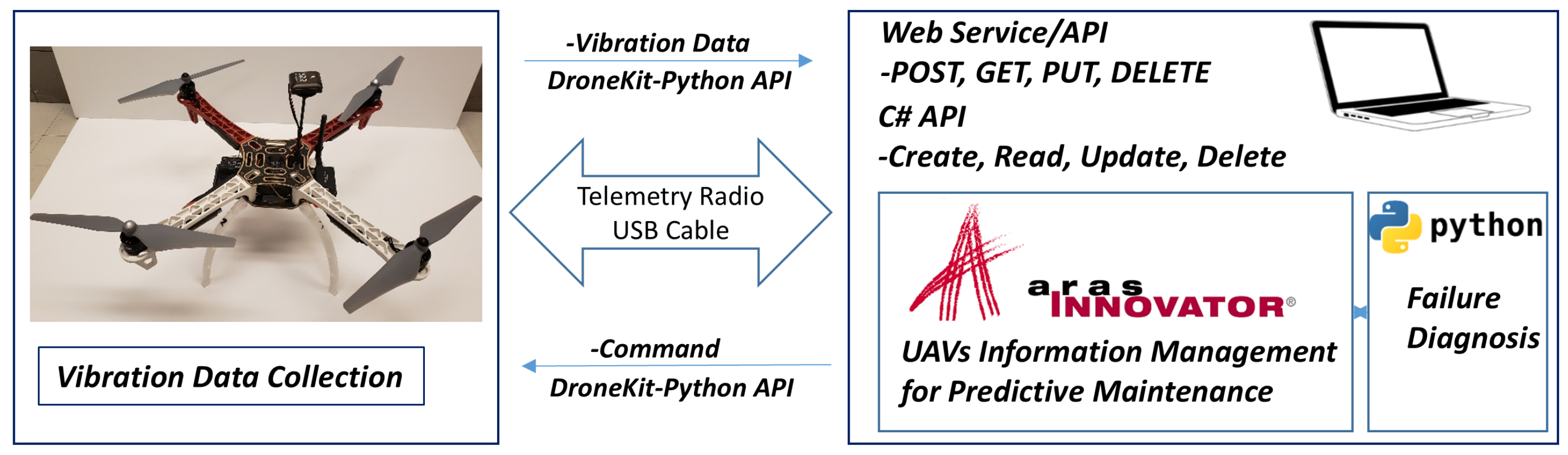As illustrated in Figure 1, vibration data is transmitted from the UAV to the computer using either a USB cable or telemetry radio. In this study, a USB connection is used during the pre-flight stage to ensure reliable, high-bandwidth data transfer. The system architecture illustrating real-time vibration data acquisition from the UAV using DroneKit-Python API, followed by fault classification and integration with the Aras Innovator PLM platform for maintenance data management, is depicted in Figure 1.