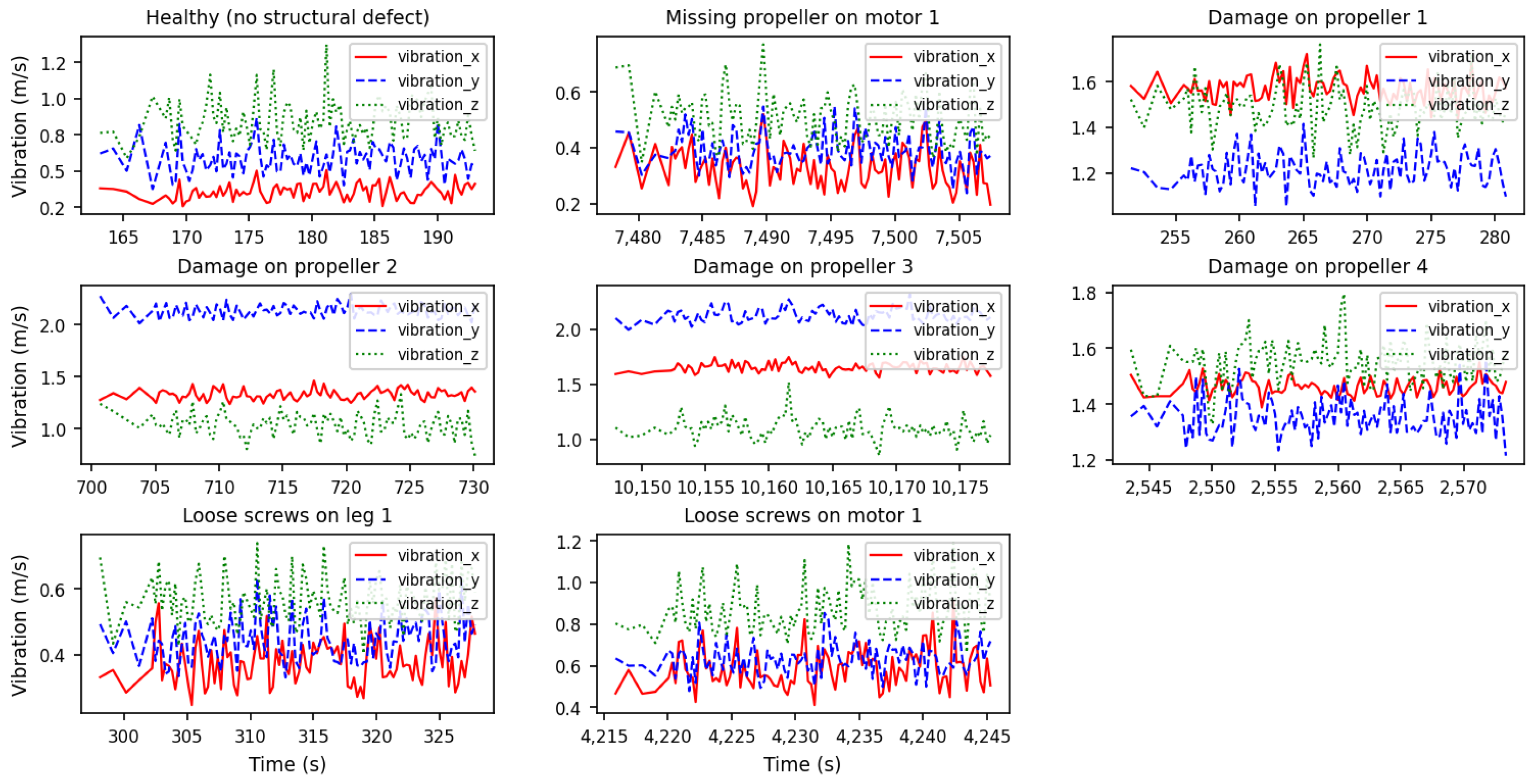Among these, vibration-based SHM has proven to be an effective non-destructive method for detecting anomalies such as loose motors, damaged propellers, or unbalanced components during the pre-flight stage, when the UAV is powered but stationary. Accelerometers embedded in flight controllers can record time-series vibration data that provide valuable insights into component integrity. Previous studies have applied frequency-domain analyses, statistical features, and spectrum-based classifiers for UAV fault diagnosis [6,7,8,9], while more recent research has explored deep learning and transfer learning approaches for time-series fault detection in aerial systems [10,11,12].