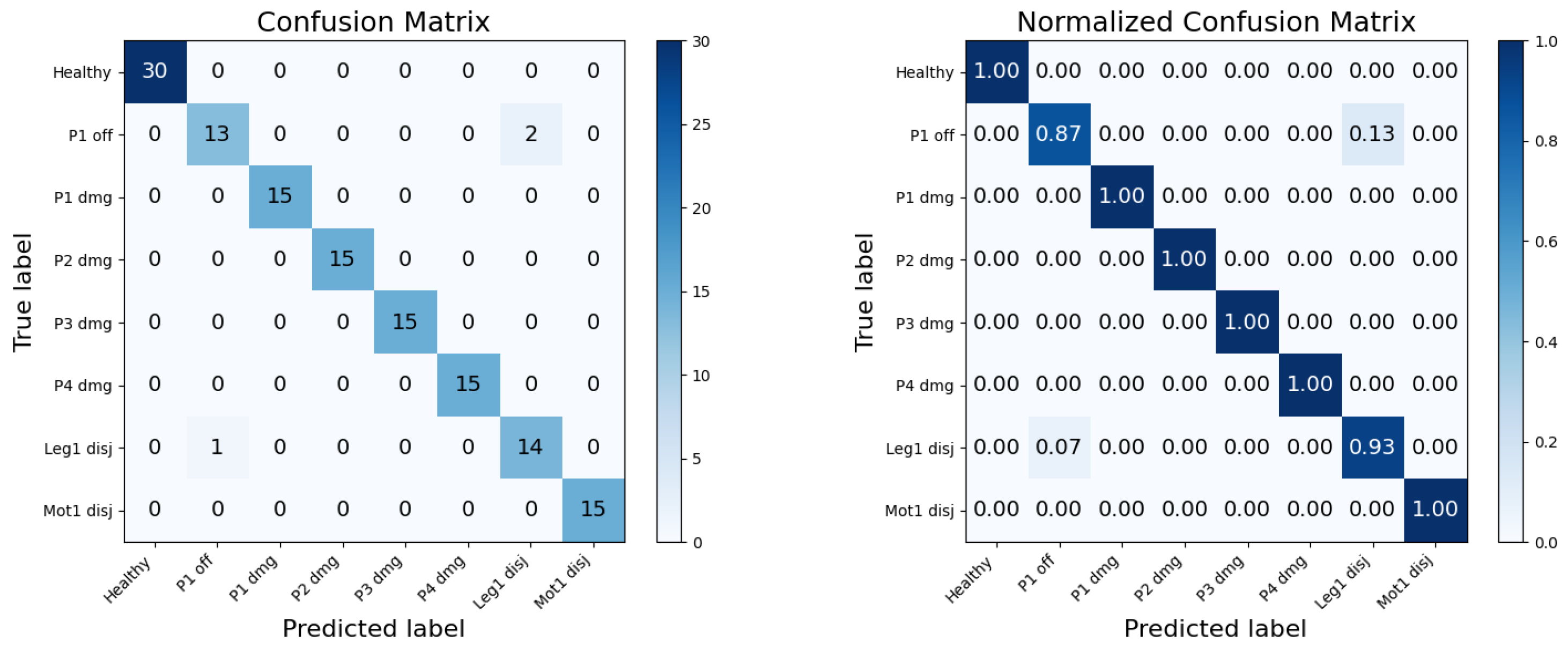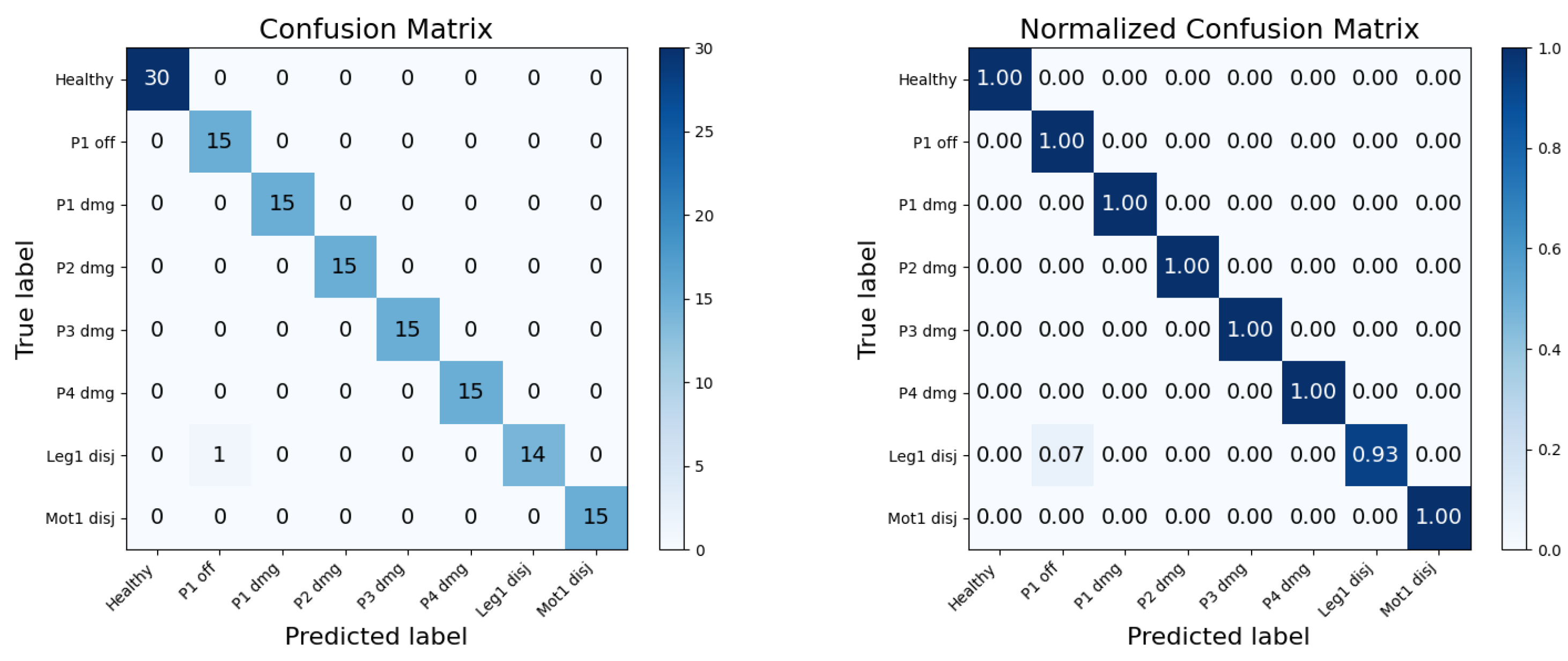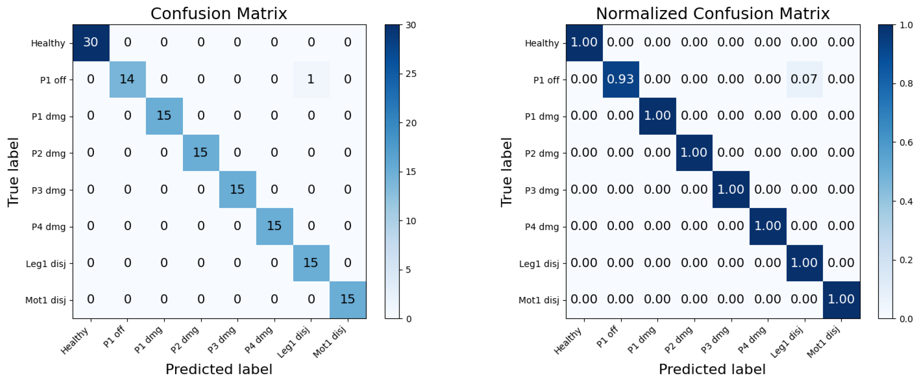 Figure 4, Figure 5 and Figure 6 present the confusion matrices and normalized confusion matrices for the CNN, GRU, and LSTM models, respectively, illustrating classification performance across all eight structural conditions. Overall classwise precision and recall are higher than 0.95, and the majority of fault categories are correctly identified. Some cases result in minor misclassifications: the GRU shows slight confusion between the “leg disjoint” and “propeller off” scenarios, the CNN occasionally confuses the “propeller off” and “propeller damaged” conditions due to overlapping vibration patterns, and the LSTM shows marginal cross-predictions between “propeller off” and “motor disjoint” faults. According to these findings, all models perform well and fairly, but the location of the fault and the signal properties affect how sensitive they are to minute vibration variations.