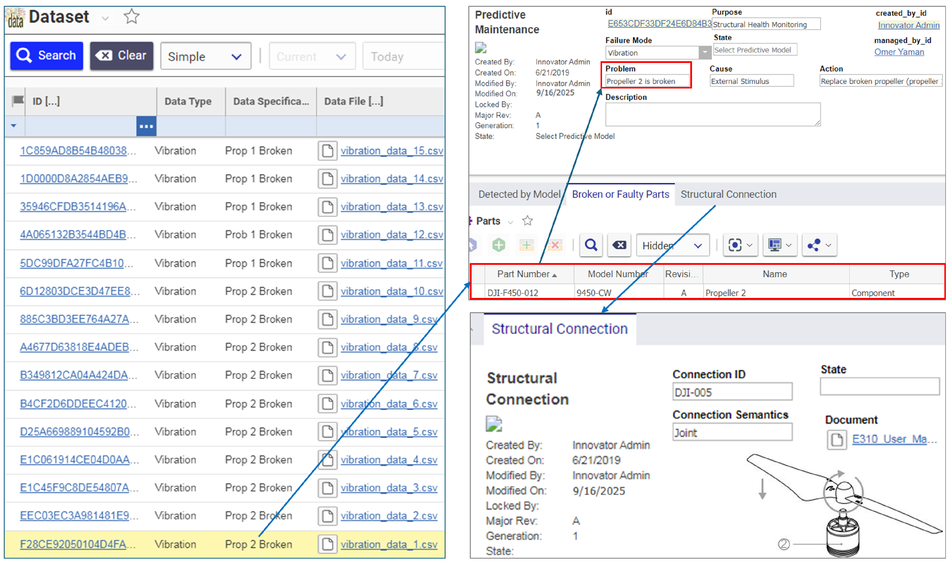 Vibration datasets are collected from a quadcopter to train and evaluate three different time-series classification models: Gated Recurrent Units (GRUs), Long Short-Term Memory (LSTM), and Convolutional Neural Networks (CNNs). The GRU model, selected based on accuracy and efficiency, is deployed for real-time fault classification during UAV operation. This model, along with associated training and test datasets, is stored and versioned within the Aras Innovator PLM system, making it readily accessible during development and deployment stages.