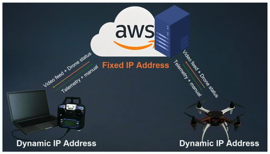 Several other studies employ cloud- or server-based architectures; however, their data types and system objectives differ from those presented here. In [32], a cloud service is used to relay MAVLink messages from a Pixhawk flight controller, but no video transmission component is included. In contrast, the proposed architecture simultaneously supports reliable TCP-based telemetry transfer and a high-bandwidth UDP-based H.264 video stream. The study [14] also utilizes AWS for video and telemetry transmission, but it is designed for a fixed-wing platform, which exhibits substantially different C2 requirements compared to the rotary-wing UAV considered in this work. Additional studies, such as [33,34], use cloud servers to transmit low-bandwidth sensor data (e.g., radionuclide or atmospheric measurements) over protocols such as MQTT, representing application scenarios fundamentally different from systems requiring concurrent streaming of live video and real-time C2 commands.