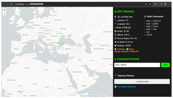 The AWS server hosted a web application that provided the operator with an integrated interface for telemetry monitoring and video streaming. The interface shown in Figure 3 presents the live video feed from the UAV in real time, along with the corresponding frame rate and frame processing delay. Operators could also adjust parameters such as frame rate, JPEG quality, encoding mode, and recording state directly through the interface, with changes instantly relayed to the UAV via TCP sockets. In addition to video streaming, a telemetry web-based dashboard, as illustrated in Figure 4, displays flight data such as GPS coordinates, altitude, heading, ground speed, and flight mode. The map view enables real-time tracking of the UAV’s position, while quick command shortcuts allow operators to switch flight modes or arm/disarm the system with a single click. A command console was included for sending MAVLink-compatible text commands, as well as a waypoint planner that supported uploading full flight paths to the UAV. This web application was platform-independent, requiring only a browser and network access, which made it possible to monitor and control flights from any authorized device connected to the internet.