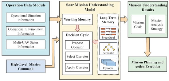 16]. Drawing inspiration from human cognitive decision-making mechanisms, CogMUS leverages the strengths of the Soar architecture in symbolic representation, problem-solving, and structured learning. By integrating knowledge engineering methods, we aim to construct a cognitive framework capable of rapid and accurate situational awareness and assessment, as well as deep comprehension and decomposition of cooperative missions. Through this approach, we expect to enhance the mission understanding capabilities and collaborative operational effectiveness of multi-UAV systems in complex and dynamic environments.