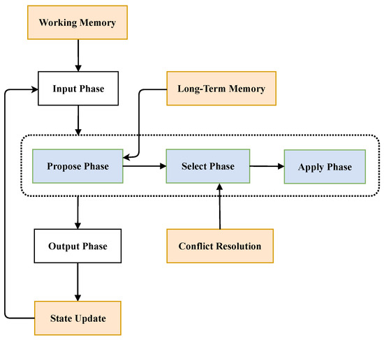Figure 1. The Operation Data Layer receives raw sensor data and environmental information, feeding it into Soar’s WM. The intermediate Soar Mission Understanding Layer performs a deep analysis of the mission intent by analyzing situational elements and matching them against high-level directives, generating concrete action plans and coordination strategies. Each UAV’s Soar agent reasons through its core decision cycle (Input-Propose-Select-Apply-Output). The final operator selected within the DC is outputted to the lower Mission Planning and Action Execution Layer. The UAV then executes this action, thereby altering the current state.