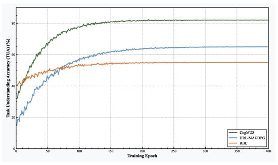 Figure 4 illustrates the evolution of TUA during training. The results clearly indicate that CogMUS demonstrates significantly superior learning efficiency and final performance. Our method exhibits an exceptionally steep initial learning curve, surpassing 80% accuracy within approximately 120 training epochs and eventually converging to a stable, high level of around 82.5% after 250 epochs. This exceptional performance is primarily attributed to its knowledge-driven cognitive mechanism. The Soar architecture leverages the rich set of production rules in its LTM to perform efficient symbolic reasoning and zero-shot decomposition of high-level mission intent, thereby bypassing the extensive trial-and-error exploration required by reinforcement learning.