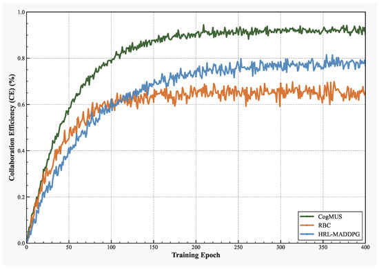 Figure 5 depicts the change in CE over training epochs, a metric that directly reflects the swarm’s ability to translate mission understanding into spatiotemporally coordinated actions. CogMUS again shows the best performance, with its CE rapidly climbing and stabilizing at an extremely high level of over 90% with minimal volatility. This is attributed to two core functionalities within the CogMUS framework: (1) precise mission understanding and decomposition lay a clear foundation for subsequent coordination; (2) Soar agents can achieve deep intent alignment and proactive trajectory planning through shared WM states and built-in deconfliction rules (as shown in Rule Example 2,