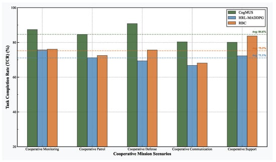 Figure 6 presents the average TCR of the three methods across five different mission scenarios. The bar chart intuitively shows that CogMUS achieved the highest completion rate in all tested scenarios, with an average TCR of 84.6%, significantly higher than HRL-MADDPG (71.1%) and RBC (75.2%). Its advantage is particularly pronounced in the “Cooperative Defense” scenario, which demands rapid response to dynamic anomalies and agile resource scheduling, where its TCR approaches 90%. This validates the framework’s strong generalization capability and adaptability to different mission constraints. In contrast, HRL-MADDPG’s performance fluctuates considerably across scenarios, suggesting potential overfitting to its training environment, while RBC performs more consistently, its overall performance ceiling is markedly lower than that of CogMUS, rendering it incapable of handling all types of complex missions. This series of comparative results substantiates the superior execution capability and high reliability of the CogMUS framework under diverse operational demands.