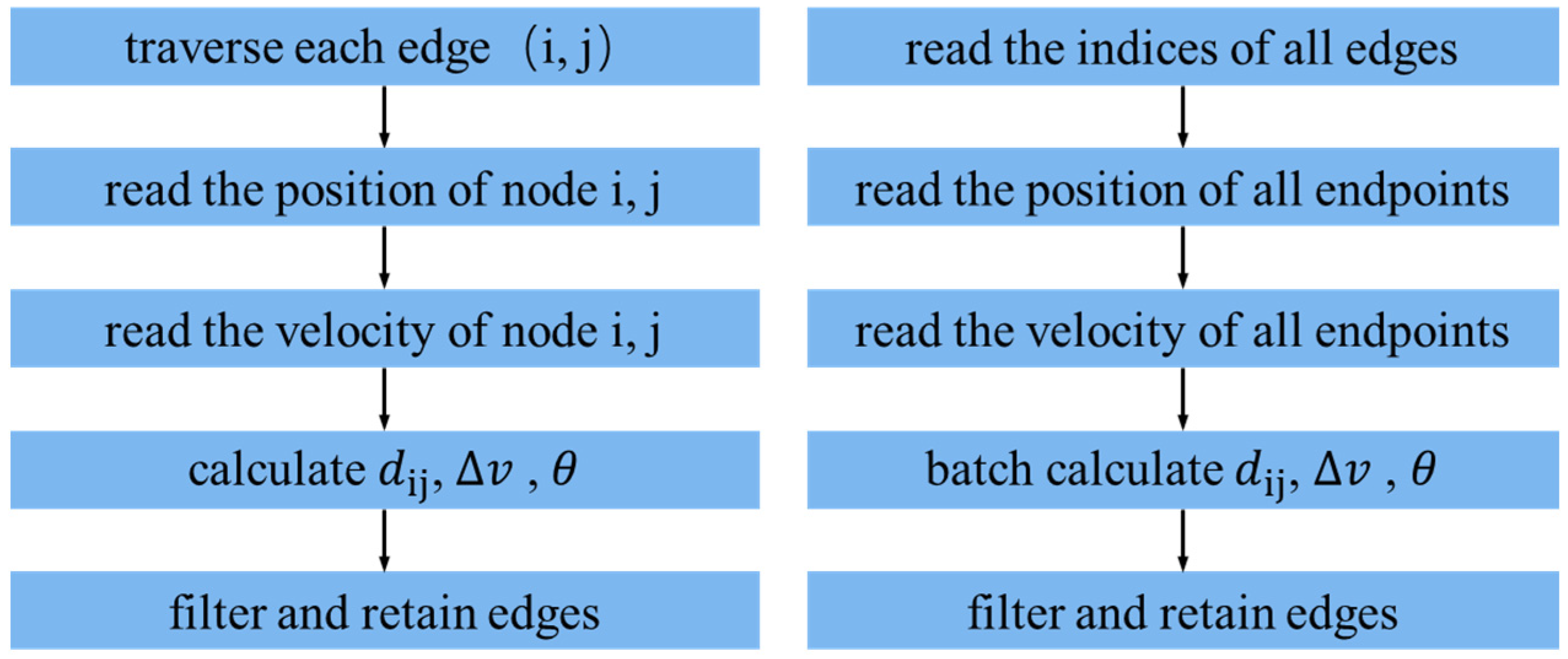 | # Loop-based version (simplified) for (i, j) in edges: d = ||pi - pj|| dv = |vi - vj| theta = angle(vec_i, vec_j) score = -a* d - b* dv + c* cos(theta) |