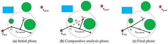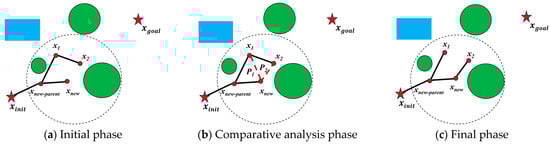 To improve the quality of the path, Karaman et al. [] proposed an RRT* algorithm, which added the ChooseParent strategy, as shown in Algorithm 2 and Rewire strategy as shown in Algorithm 3 to the RRT algorithm. As shown in Figure 1, during the comparative analysis phase, the algorithm calculates the cost of path P1 and path P2. If the cost of P2 is less than that of P1, the connection from xnew to its current parent node (xnew_parent) will be removed, and a new path from xnew to x1 will be established. Similarly, the Rewire strategy is illustrated in Figure 2: xnew is used as the parent node to connect with each nearby node and determine whether the resulting path cost is lower than the current one. If the resulting path cost is lower, the parent node is updated to xnew.