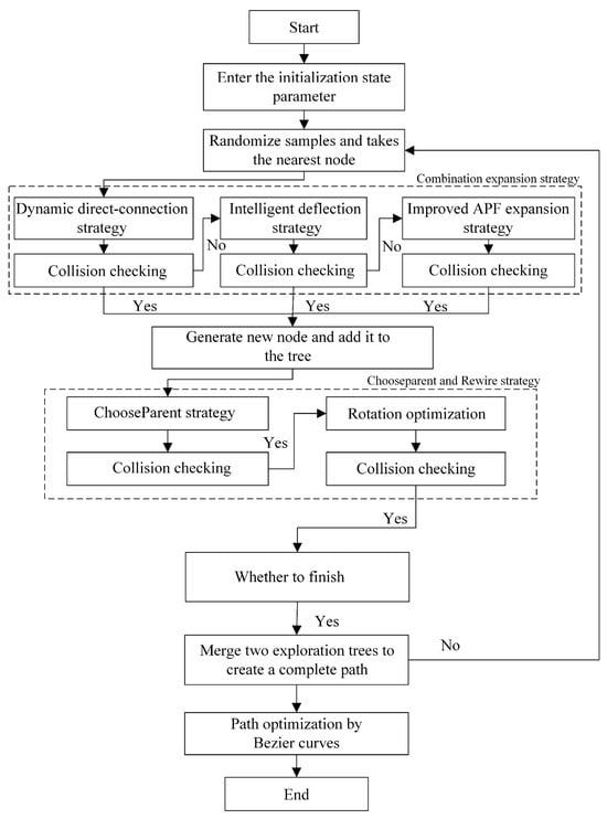 Various path planning approaches can be distinguished by the principles they rely on, including graph search algorithms [,], learning-based systems [,], interpolation-based trajectory design [,,], and sampling-based planning methods [,]. Sampling-based algorithms in the configuration space, followed by collision detection and connection verification between neighboring points. These methods are probabilistically complete—meaning they will asymptotically find a solution if one exists as the number of samples increases. This makes them well-suited for complex environments. Although the Rapidly exploring Random Tree (RRT) approach typically offers better computational performance than Probabilistic Roadmap method (PRM), it tends to converge slowly and frequently yields non-optimal trajectories, primarily due to its stochastic sampling mechanism and basic node expansion strategy.