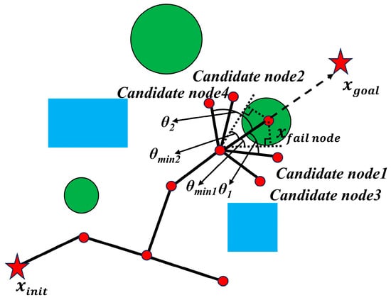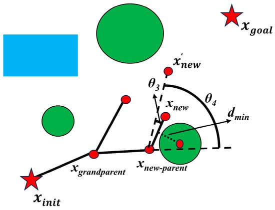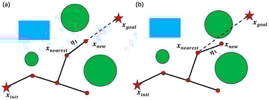 To enhance expansion efficiency, Rybus et al. [] introduced the BI-RRT* algorithm, which builds two trees simultaneously. One tree grows from xinitial toward xgoal, while the other extends from xgoal toward xinitial. The two trees keep expanding toward each other during the planning process. When a pair of nodes is found within the defined distance threshold and the direct path between them is collision-free, the trees are connected.