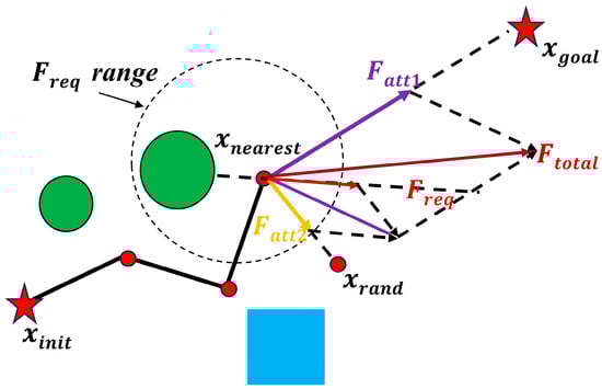 To enhance the local exploration ability of the algorithm, Qureshi et al. [] improved the RRT* framework by integrating an artificial potential field (APF) strategy to influence the tree expansion. Obstacles exert repulsive forces on xn, and target points exert attractive forces on xn. The growth of the exploration tree is guided by the resultant force. The pseudocode of APF-RRT* is shown in Algorithm 4.