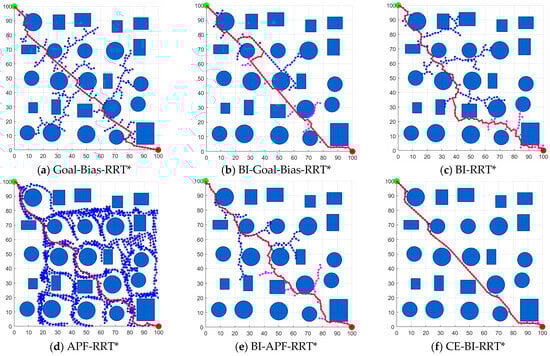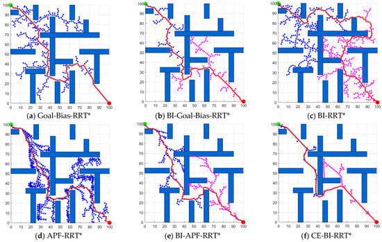 The results for Environment B are visualized in Figure 10, while the corresponding numerical data are tabulated in Table 1. In Environment B, although BI-RRT* is capable of finding a feasible path with relatively fast speed and fewer iterations, its path generation quality is significantly affected by the high randomness in both sampling and expansion processes. As a result, the algorithm produces an average path length of 178.87 and an average turning angle of 32.18°, both of which are considerably higher than those achieved by other comparison algorithms. With an increased number of obstacles in Environment B, the APF-RRT* algorithm experiences more complex force field interactions during path expansion, making it difficult to move directly toward the goal in each iteration. This leads to higher computational costs. BI-APF-RRT* improves exploration efficiency through the use of a bidirectional tree strategy; however, its average running time remains as high as 4.69 s. Moreover, the inconsistent expansion directions between the two trees further increase the average turning angle of the generated paths. Goal-Bias-RRT* and BI-Goal-Bias-RRT* utilize goal node information to guide the search direction, effectively reducing redundant nodes and accelerating the overall search process. However, when obstacles block the direct path to the goal, Goal-Bias-RRT* encounters significant difficulty in expanding the search tree, thereby degrading its performance. In contrast, the proposed CE-BI-RRT* algorithm adopts a combination expansion strategy. This approach significantly enhances the expansion efficiency of the search tree. As shown in Figure 10 and Table 1, CE-BI-RRT* can efficiently avoid obstacles even in complex environments. The algorithm achieves an average runtime of only 0.17 s, an average path length of 147.09, and an average path turning angle of 9.15°. Furthermore, the improved path cost function effectively reduces both the path turning angle and path length, resulting in smoother and higher-quality paths.