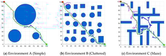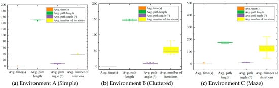 Figure 13 presents box plots of the performance metrics of CE-BI-RRT* over 50 runs in each of the three simulation environments. Observing Figure 13, it is evident that the algorithm exhibits consistent and robust performance across diverse scenarios. In Environment A, the algorithm completes path planning with the lowest path cost, minimal computation time, and fewer iterations. For Environment B, all performance metrics of the algorithm remain stable, despite a noticeable fluctuation in number of iterations. This fluctuation precisely reflects the impact of environmental changes on algorithm behavior, while also demonstrating the algorithm’s adaptability to handle increased environmental complexity. For Environment C, all metrics show a moderate increase. The relatively compact box plots corresponding to the three environments indicate low variance in algorithm performance, highlighting its reliability. Furthermore, the absence of significant outliers demonstrates that the CE-Bi-RRT* algorithm possesses strong resilience against random initialization and environmental variations across all scenarios.