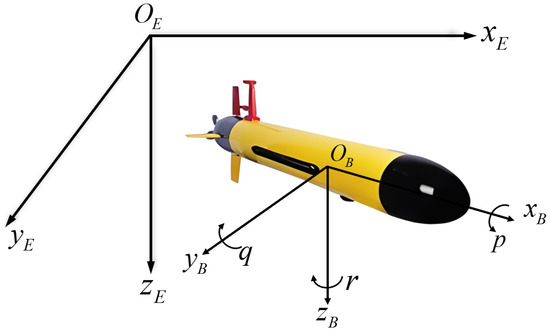 The earth-fixed frame and the body-fixed reference frame are employed to describe the motion of UUVs. The position and attitude of the UUV are defined as . is the linear velocity and angular velocity of the UUV.