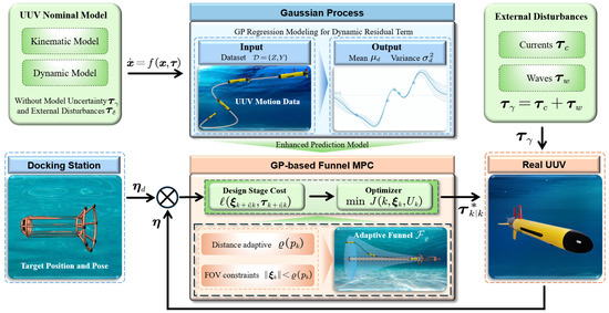 While conventional MPC has demonstrated success, its control performance is dependent on the accuracy of the model. However, the dynamic model of a UUV is highly nonlinear with uncertainties [30]. This discrepancy, collectively termed model mismatch and unmodeled dynamics, can severely degrade the predictive accuracy of MPC, leading to suboptimal performance or even instability [31]. Consequently, integrating machine learning methods with MPC to compensate for these model uncertainties has become an active area of research [32,33,34]. GP regression is a non-parametric Bayesian method particularly well-suited for this task, as it not only learns unknown nonlinear functions from data but also quantifies the associated prediction uncertainty [35,36]. It is recognized that UUVs constitute a critical class of underwater robots operating in unstructured environments. Beyond the aforementioned methods, recent advancements in underwater robotics have introduced other advanced control strategies. Deep Reinforcement Learning (DRL) has gained traction for its ability to learn complex docking policies directly from raw sensor data through trial and error. However, DRL-based approaches often suffer from poor interpretability and the difficulty of guaranteeing safety constraints during the training phase, which is risky for expensive underwater hardware. Adaptive Control techniques have also been extensively applied to handle parametric uncertainties. While effective for parameter estimation, they may struggle with transient performance and explicitly handling state and actuator constraints simultaneously. Consequently, there is a compelling need for a control framework that combines the learning capability of data-driven methods with the rigorous constraint satisfaction capability of control-theoretic approaches. This motivates the adoption of the proposed GP-based Funnel MPC.