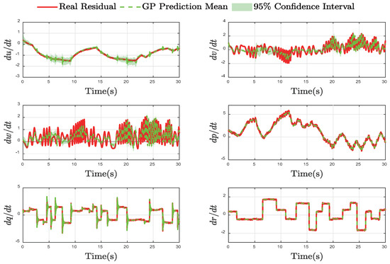 Figure 6 presents the core validation of the learning component, illustrating the GP’s ability to approximate the true residual dynamics. It is evident that the GP prediction mean tracks the true residual across all six degrees of freedom, including both low-frequency drifts and high-frequency variations. Furthermore, the true residual consistently lies within the 95% confidence bounds, indicating that the GP not only learns the system’s unmodeled dynamics but also provides a measure of its own predictive uncertainty. This result confirms that the GP has captured the underlying structure of the model–plant mismatch.