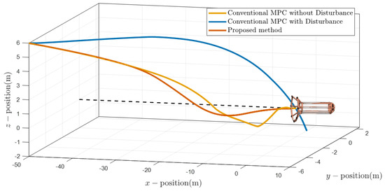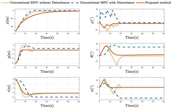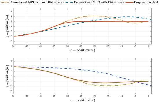 The comparative results of the docking task under the conventional MPC without disturbance, the conventional MPC with disturbance and the proposed method are presented in Figure 7, Figure 8, Figure 9, Figure 10, Figure 11 and Figure 12.